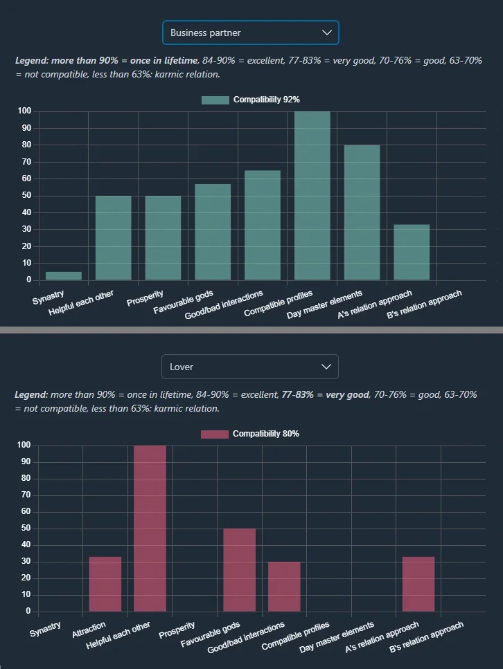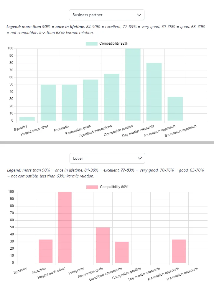 - Good/bad interactionsPositive interactions foster harmony, while challenging ones offer growth. These dynamics, analyzed through Ba Zi, highlight the natural synergy or potential conflict in a relationship.
