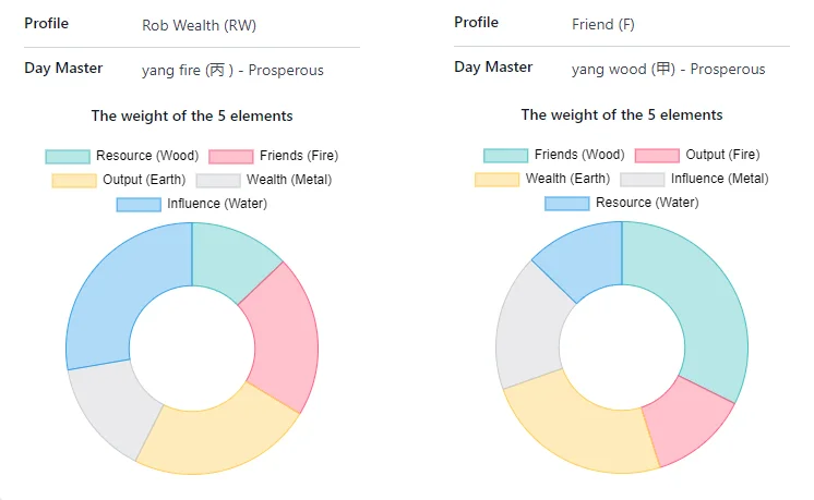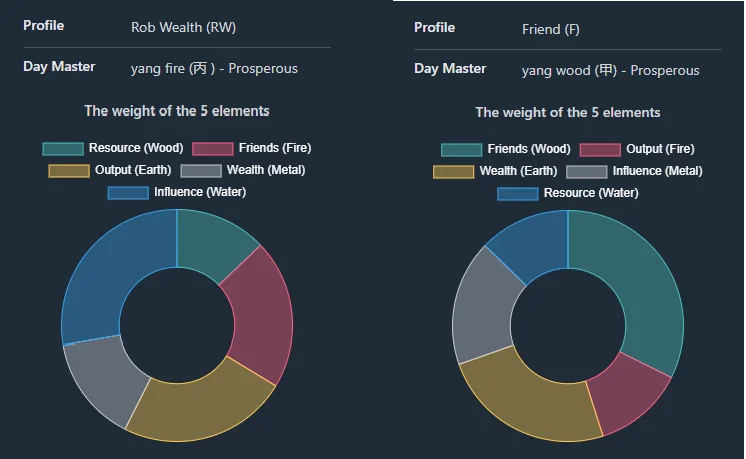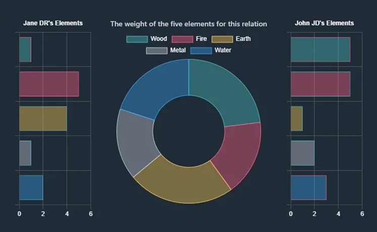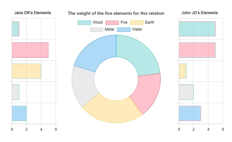 Ba Zi, grounded in the five elements, reveals profound insights into life and relationships. Destiny Charts seek balance, as any imbalance—either deficiency or excess—can disrupt harmony. When two people’s charts combine, their elements can create either a beneficial balance or, if mismatched, an undesirable imbalance that impacts the relationship. By examining both charts, practitioners gauge how elements interact, helping reveal the potential for shared harmony or areas that need attention to foster a balanced, positive connection.