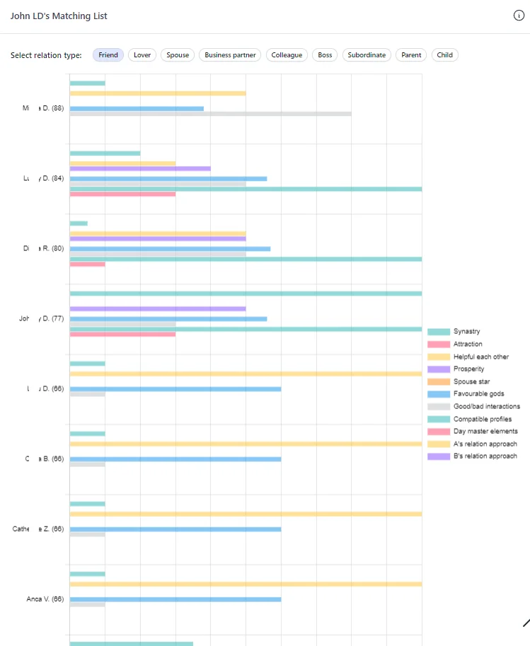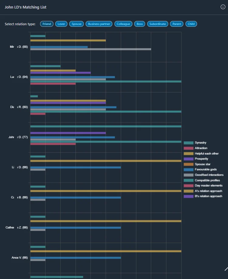 To explore your compatibility with anyone, the Compatibility Page provides a complete analysis, but what if you're dealing with a group of people? That’s where our Matching List tool comes in, sorting contacts based on criteria like love, spouse, or business partner—saving you time and energy right from the start!